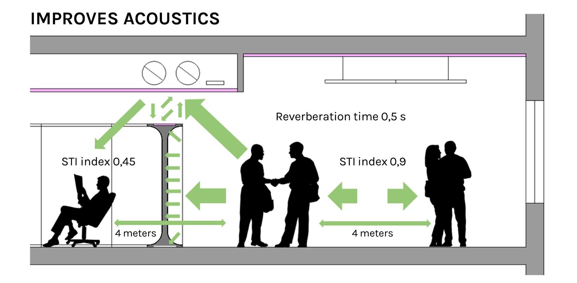 – Akustinen erinomainen – Vähentää kaikumista, parantaa puheen selkeyttä ja minimoi häiriötekijöitä.