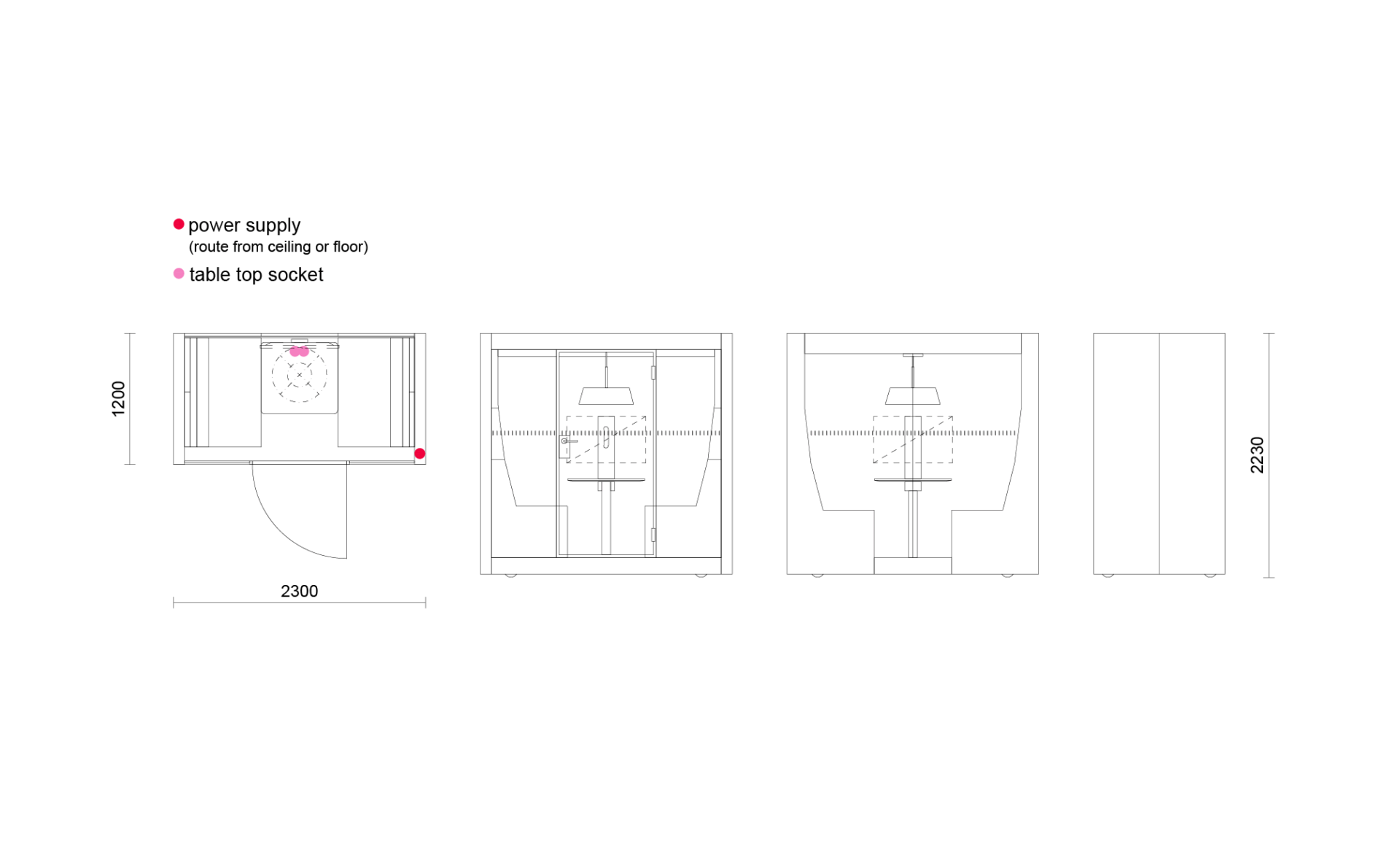 POD ROLL GLASS SMALL sisältää POINT-sohvat, pöydän pistorasioilla, kattovalaisimen sekä näyttötelineen.